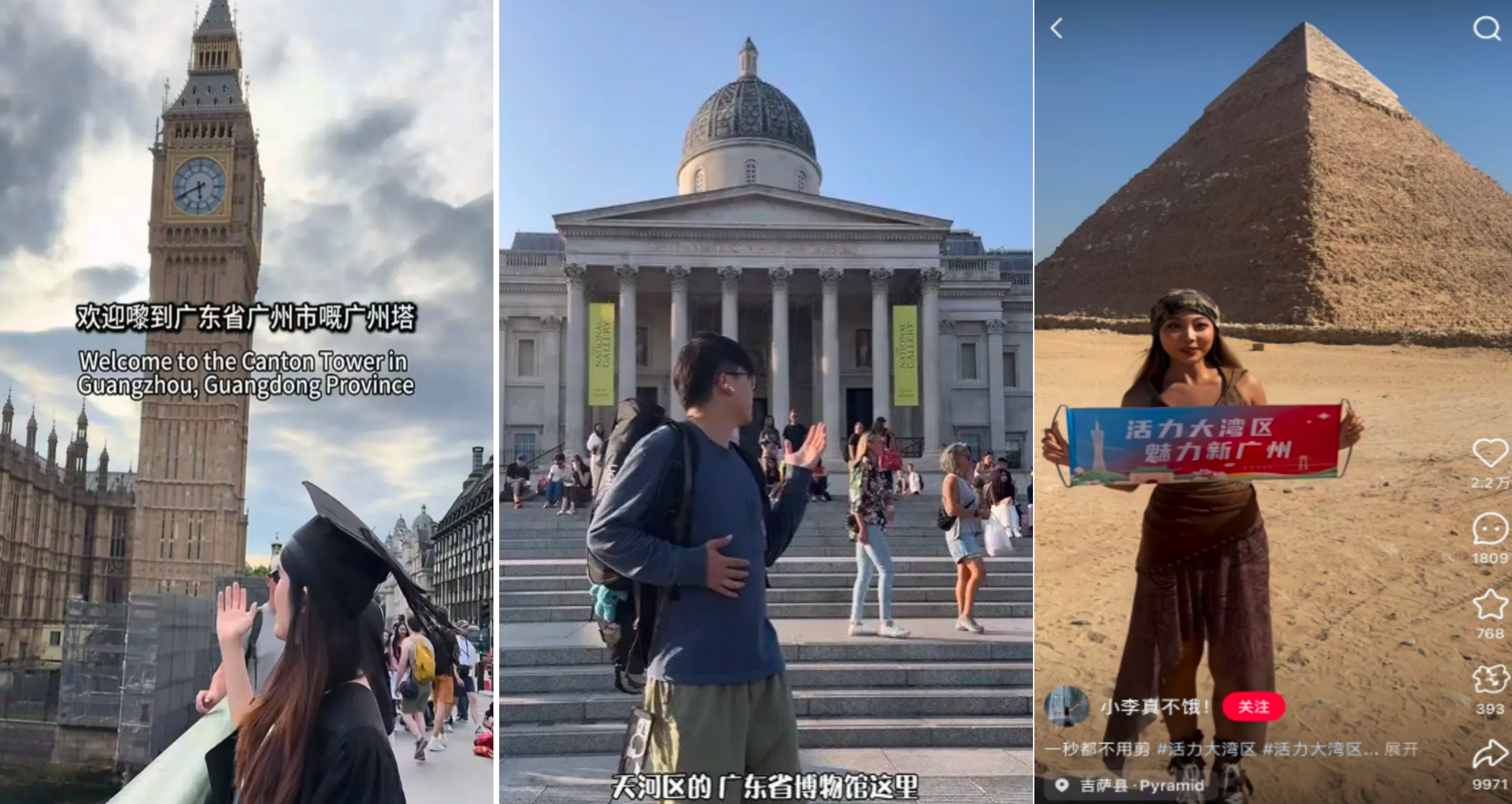 全球各地网友在巴黎塞纳河、纽约时代广场、埃及金字塔前合影,并将广州塔、白云山等地标“移植”至埃菲尔铁塔、悉尼歌剧院等全球场景,将世界各地的地标“广州化”,最后总结为“世界是个巨大的大湾区”。这波民间创意直接被官方 “盖章” 转发,火遍各大社交平台。