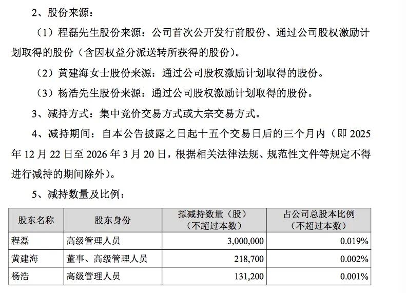 记者注意到,拟减持的高管均持有通过股权激励取得的股份。其中,高管程磊计划减持不超过300万股,占公司总股本的0.019%,其股份来源包括公司首次公开发行前股份及通过股权激励计划取得的股份(含权益分派送转股份);董事、高管黄建海计划减持不超过21.87万股,占总股本0.002%;高管杨浩计划减持不超过13.12万股,占总股本0.001%,后两者股份均来自公司股权激励计划。